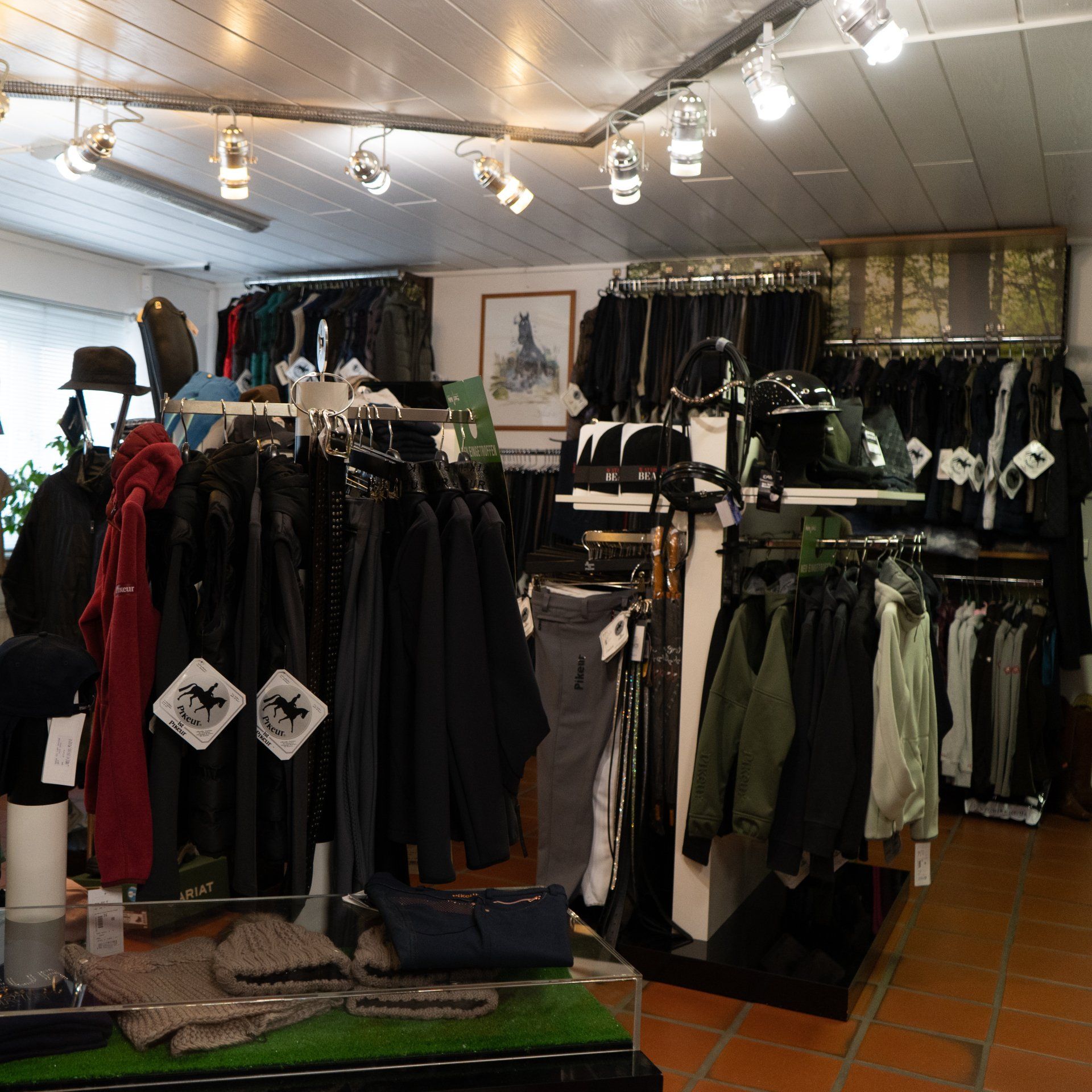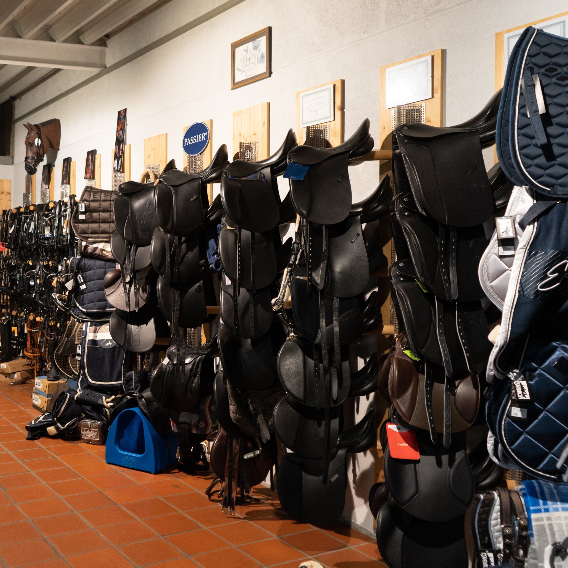 Neben Reithosen, Jacken, Shirts, Stiefeln, Schuhen, Sätteln und Zubehör, Decken, Schabracken, Halftern findet man bei uns auch Produkte für den Stall, zur Pferdepflege und für das Longieren.