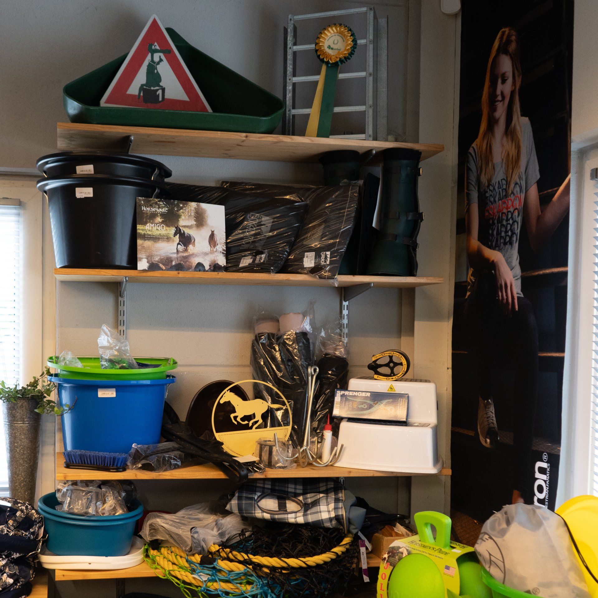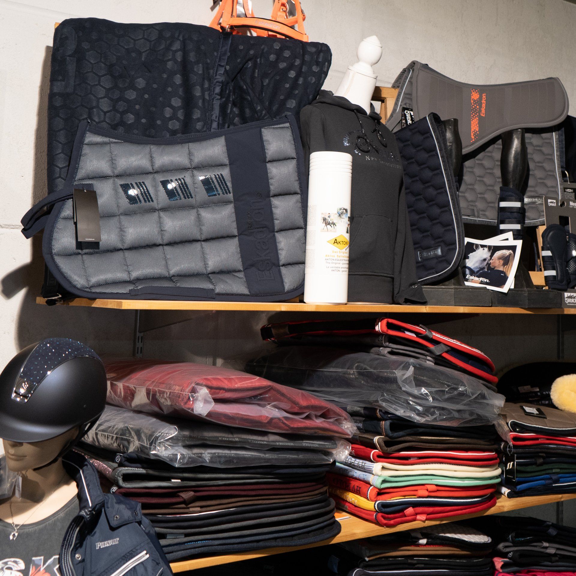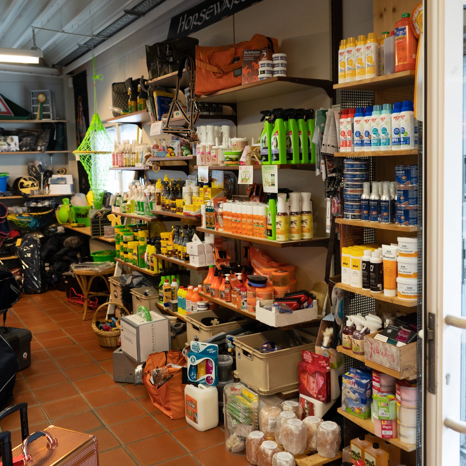 Neben Reithosen, Jacken, Shirts, Stiefeln, Schuhen, Sätteln und Zubehör, Decken, Schabracken, Halftern findet man bei uns auch Produkte für den Stall, zur Pferdepflege und für das Longieren.